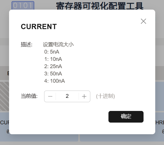 "description": "设置电流大小 \n 0: 5nA\n 1: 10nA\n 2: 25nA\n 3: 50nA\n 4: 100nA",