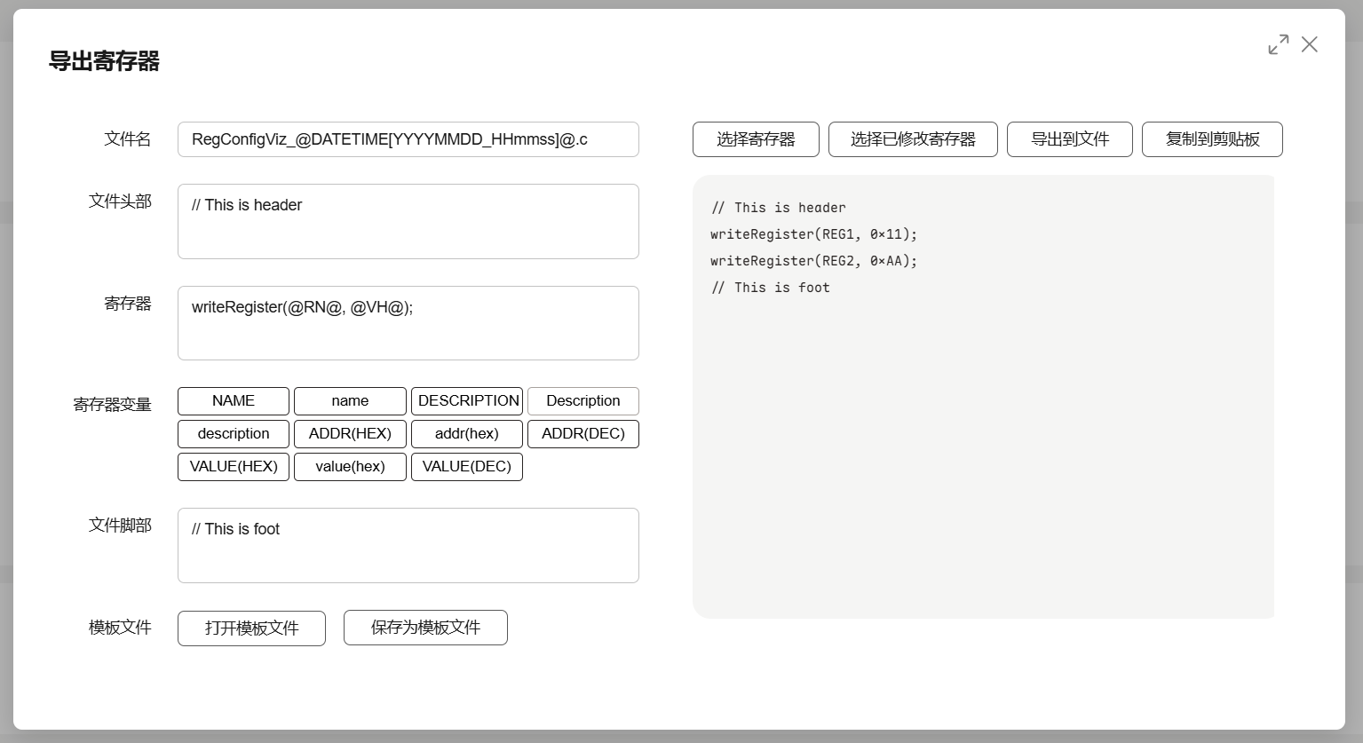 - 把当前工作区的寄存器值导出为代码格式。